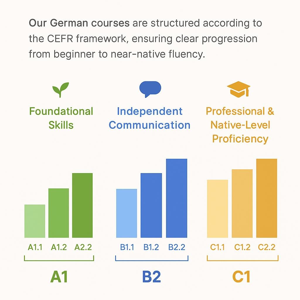 At Kherasprachschule, our German language programs follow the Common European Framework of Reference for Languages (CEFR) — the international standard used across Europe and recognized worldwide. Each level is carefully designed to help you build fluency step by step, combining grammar, conversation, and cultural understanding in an interactive and practical way.